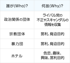 では、だれがどんな目的で盗聴器、盗撮器を仕掛けているのでしょうか。